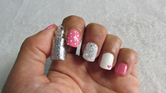 O poá é legal, mas eu queria mais. Então coloquei um pouco de glitter sobre o branco para deixar a minha unha com mais destaque. Eu gosto de unhas bem coloridas, diferentes e que chamam a atenção.