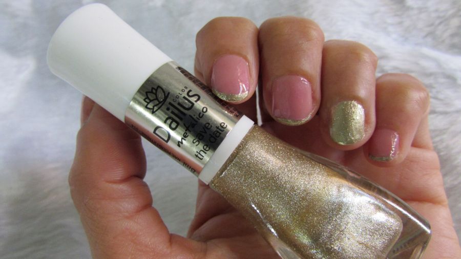 O esmalte dourado é o Save The Date da Dailus. É um dourado muito bonito, fácil de esmaltar e bem brilhante do jeito que eu adoro. Eu pretendia fazer apenas uma filha única com ele e como sempre, mudei o que tinha em mente para fazer as inglesinhas e dar um pouco de cor para as pontas das unhas.